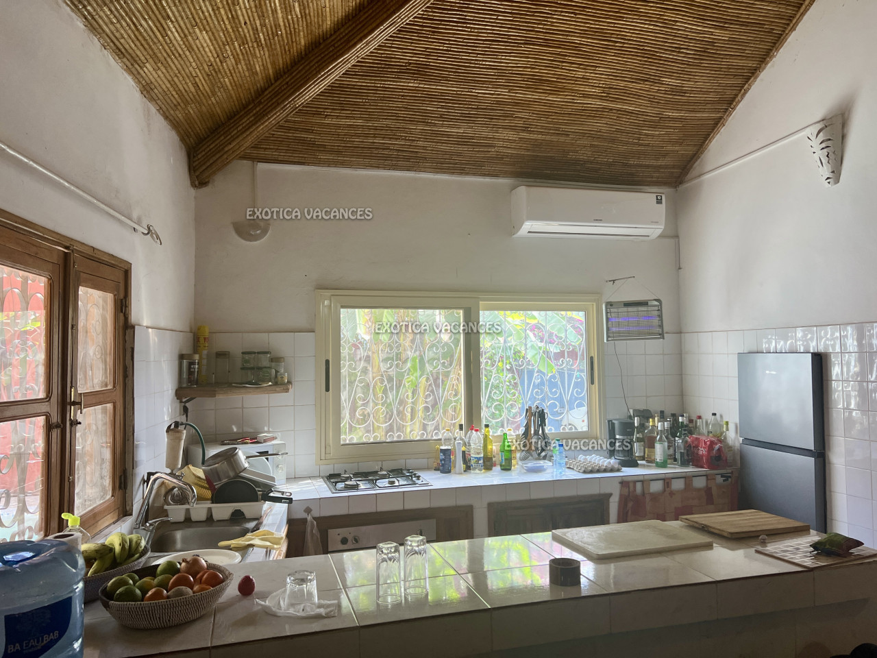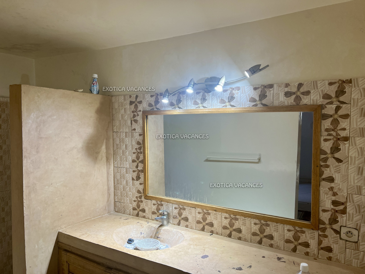 À l’extérieur : piscine au sel, parking pour 1 voiture, local gardien, puits, réserve d’eau de 500 L et toiture en tuiles.
