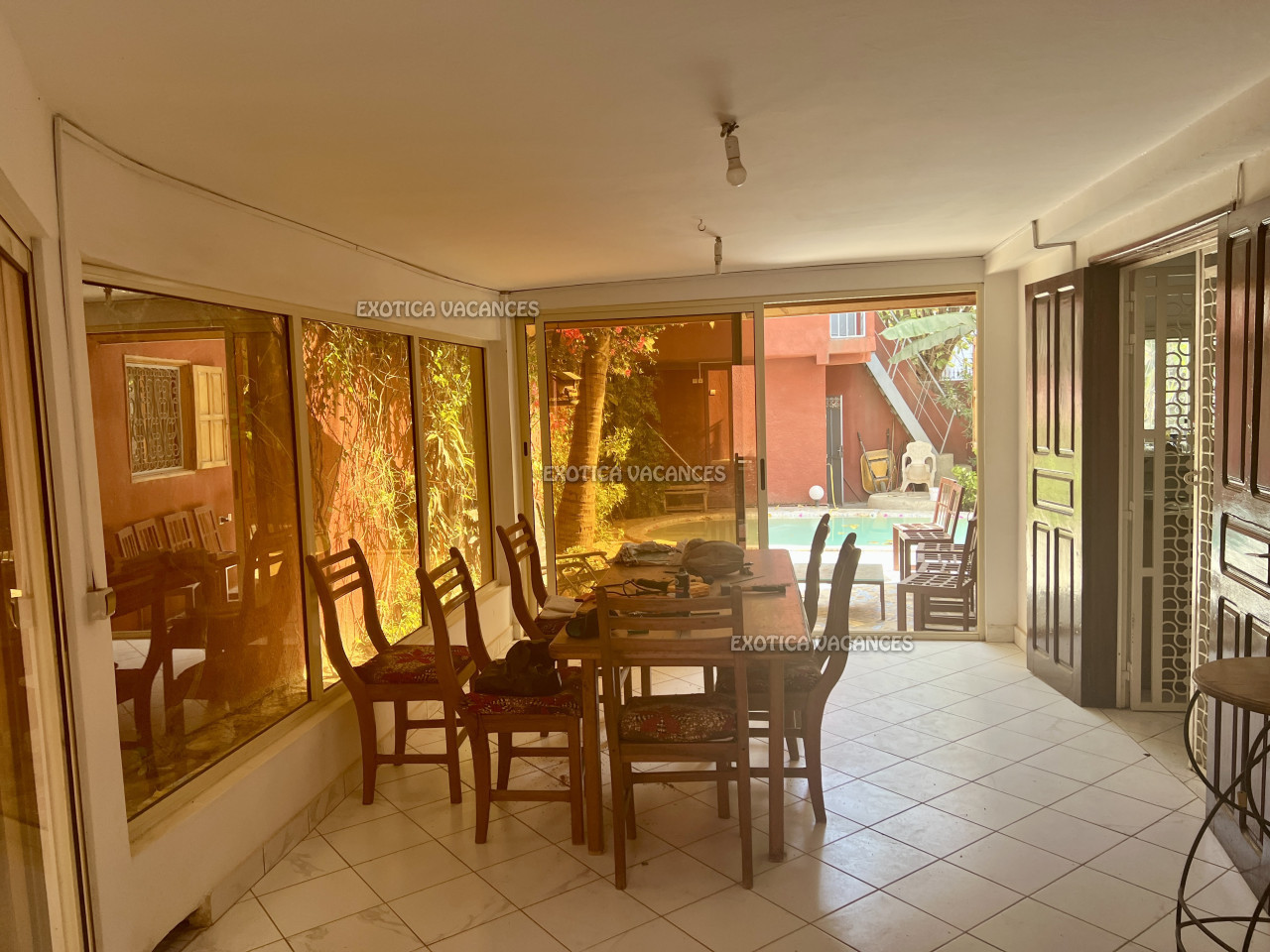 À l’extérieur : piscine au sel, parking pour 1 voiture, local gardien, puits, réserve d’eau de 500 L et toiture en tuiles.