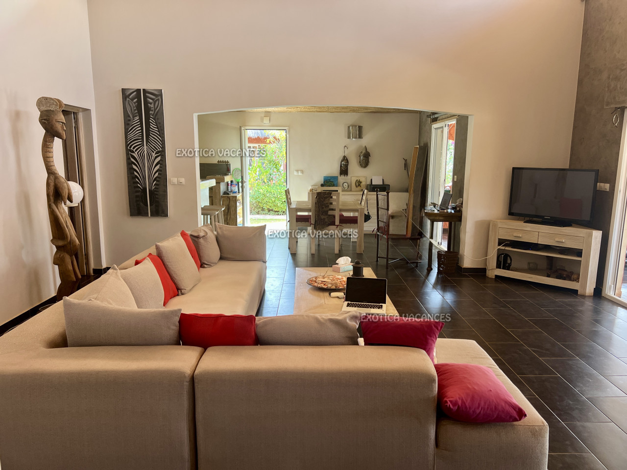 À l’extérieur, le jardin réserve de belles surprises avec une case cuisine parfaite pour les réceptions, ainsi qu’une case chambre supplémentaire, idéale pour accueillir famille ou invités.